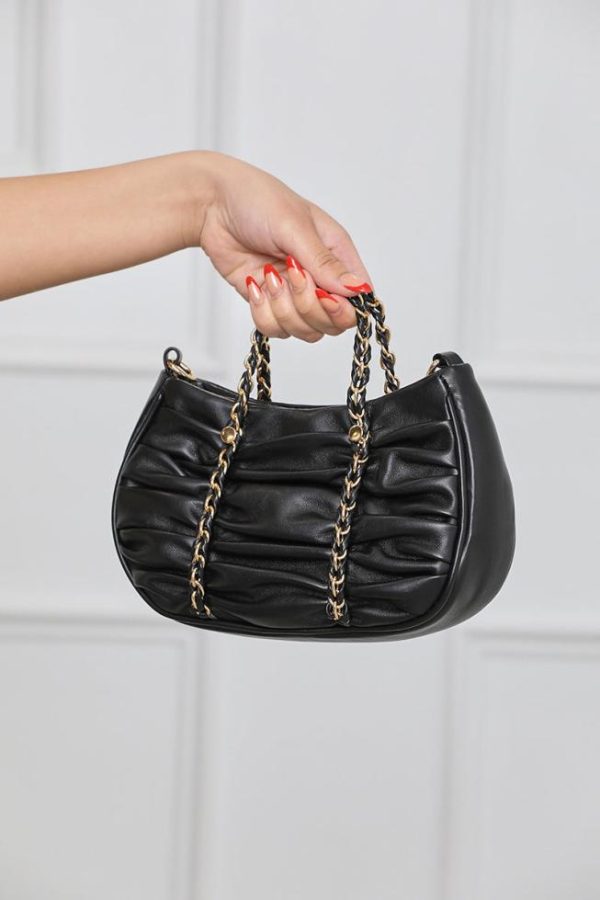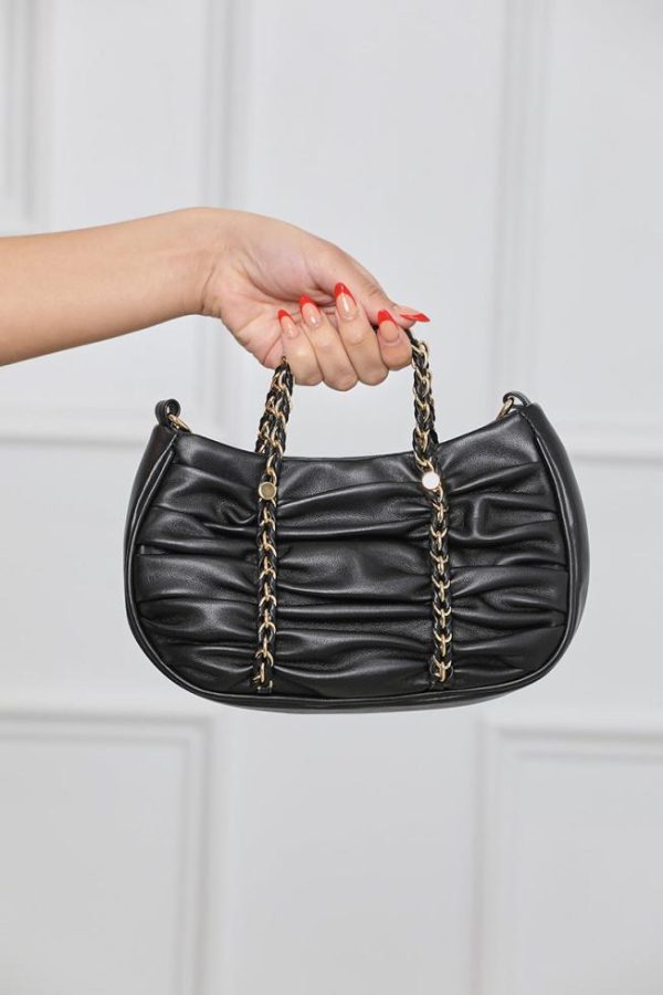 We’re loving this super-chic vegan leather shoulder bag! Featuring ruched detailing, attached gold chain detailing, removable shoulder strap, and full interior lining, this bag adds the perfect touch to almost every look!