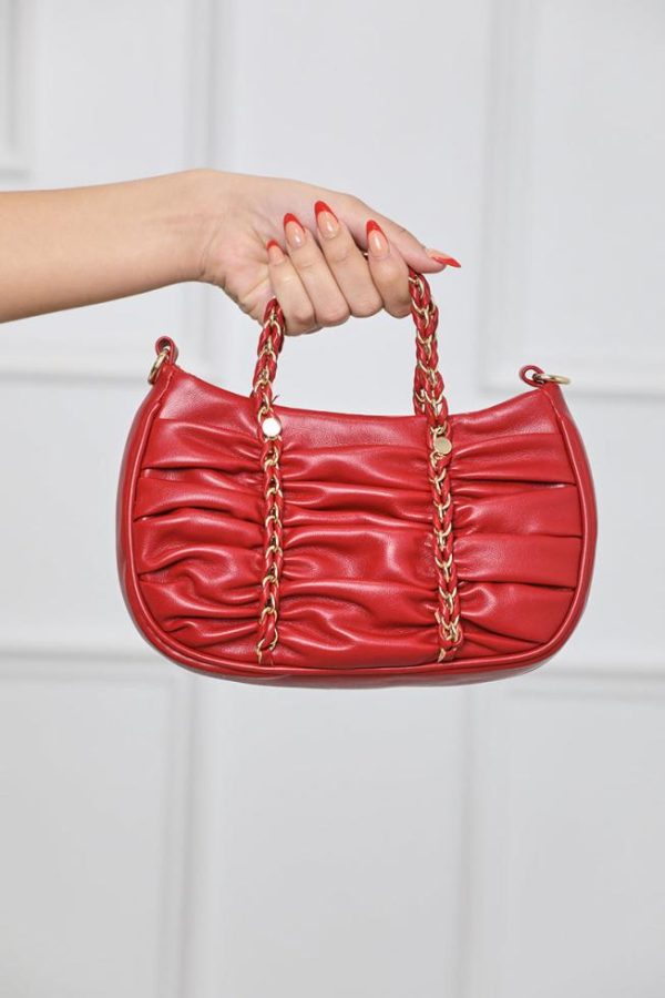 We’re loving this super-chic vegan leather shoulder bag! Featuring ruched detailing, attached gold chain detailing, removable shoulder strap, and full interior lining, this bag adds the perfect touch to almost every look!