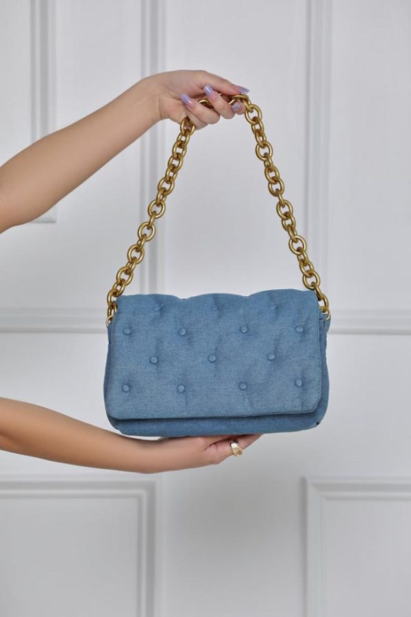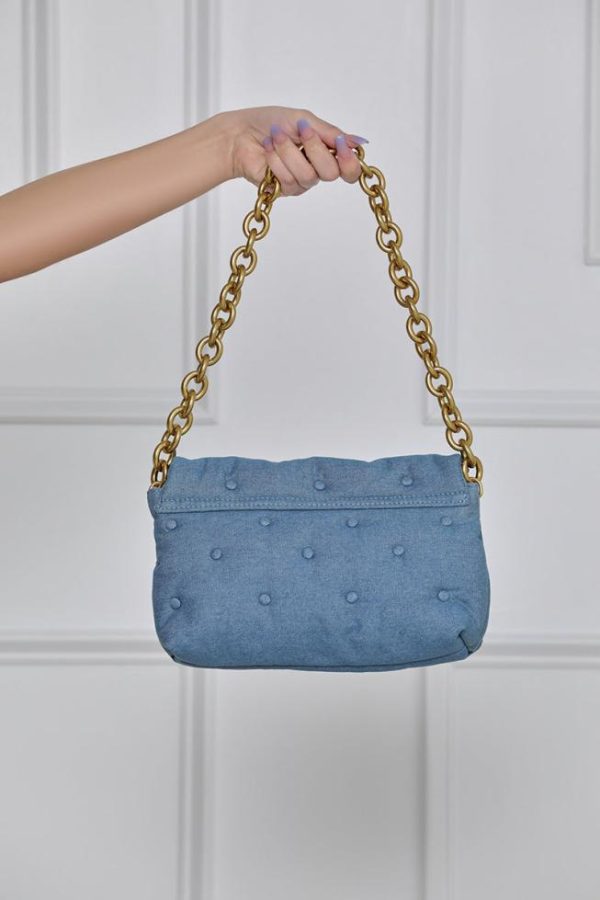 This shoulder bag is an essential for your wardrobe girl. Versatile and great for all seasons! Featuring a denim fabric, quilted design, fold over detail, snap closure and thick gold chain handle. Pair with your outfit of the day to complete your look.