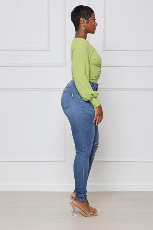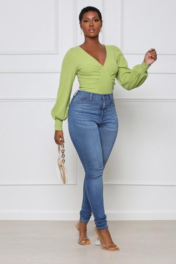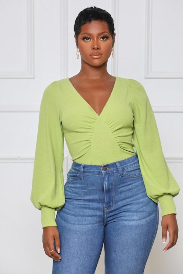 This figure-flaunting Long Sleeve Ruched Bodysuit will have you looking your best on any day of the week. An eye-catching, fully ribbed, bodysuit that highlights the long balloon sleeves and a thong bottom with a snap button panty closure and deep v-neckline. A soft nude handbag & your favorite hip-hugging denim pants will complete your daytime look for your lunch date!