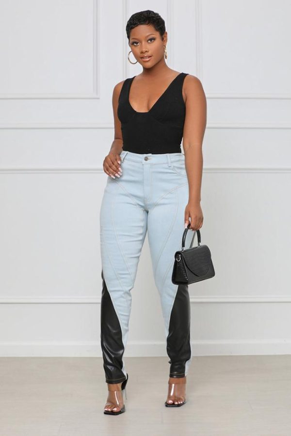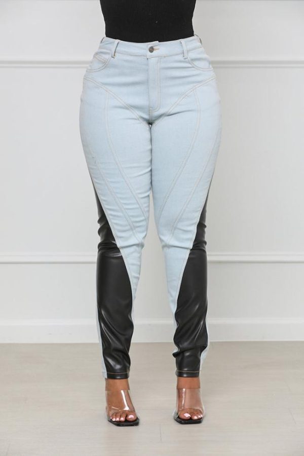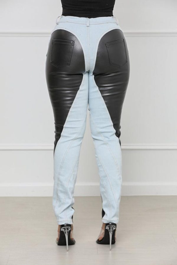 Add edgy vibes to your everyday look with these straight leg jeans featuring a faux leather design, front pockets and zipper and button closure. Pair with a simple but sassy top and highs for a complete look.