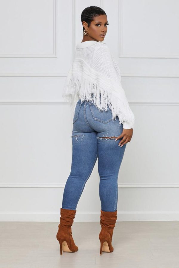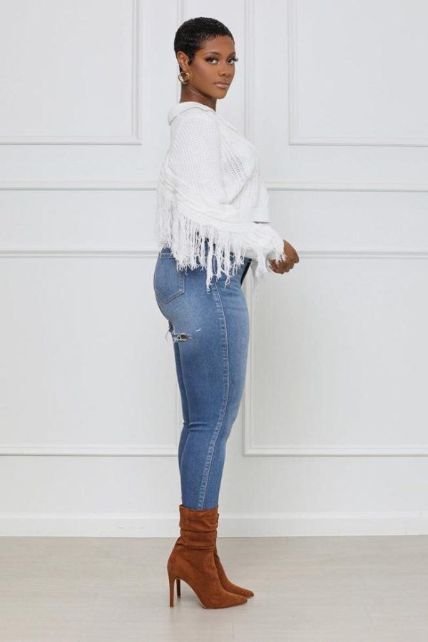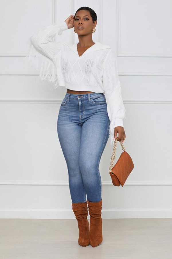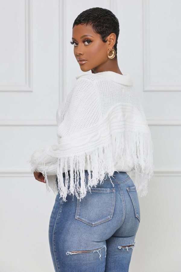 We’re loving the details in this sweater; featuring a classic collar neckline, fringe detail, cable knit design and long sleeves. Pair with high rise jeans, boots and a handbag for a complete outfit of the day.