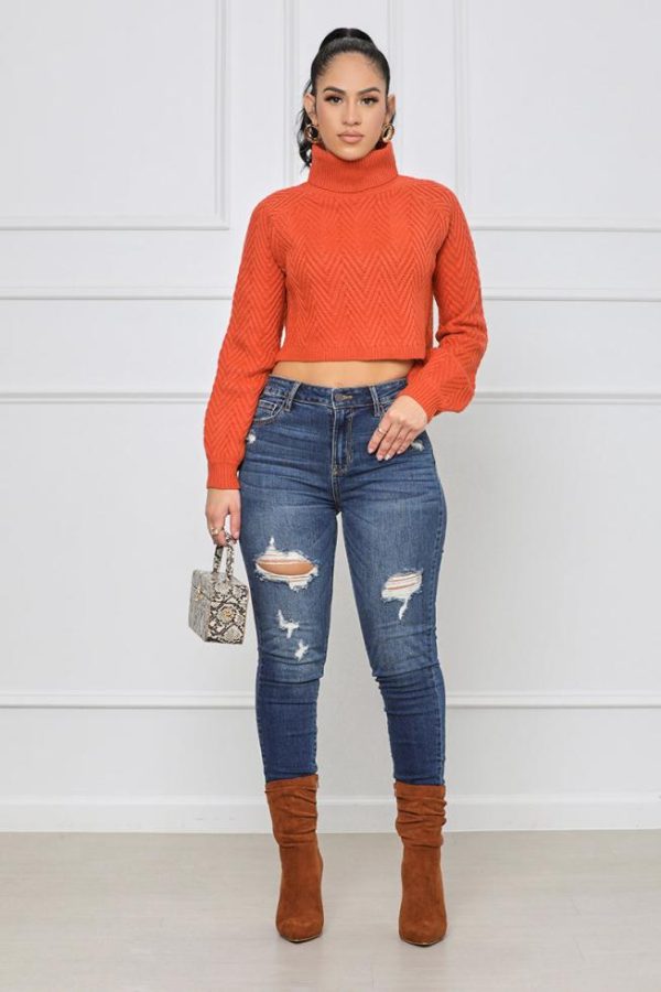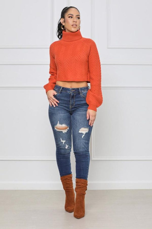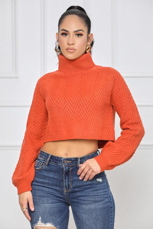 You need this super cute cropped sweater in your knit kollection babe! It keeps you cute and warm and is versatile enough to wear almost anywhere! This cropped knit sweater features a rolled turtleneck collar, slightly puffed long sleeves, and a chevron-patterned knit material. Wear this with your favorite high waist jeans and thigh-high boots or a bootie for the perfect fall look.