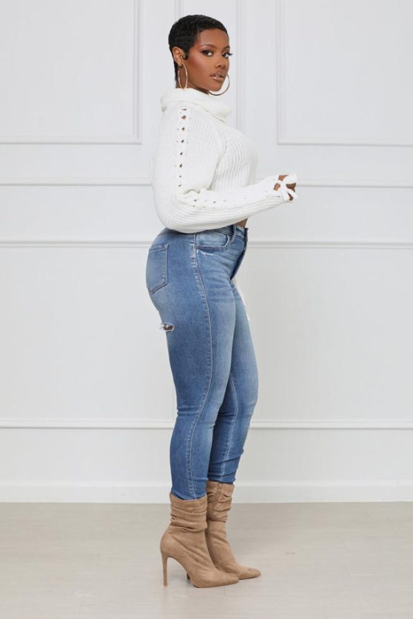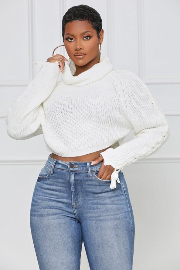 This super cute cropped sweater features a high turtleneck collar and long sleeves with a woven ribbon knit design down the sides.Pair with your favorite high-rise denim jeans and thigh-high boots or a bootie for the perfect look.