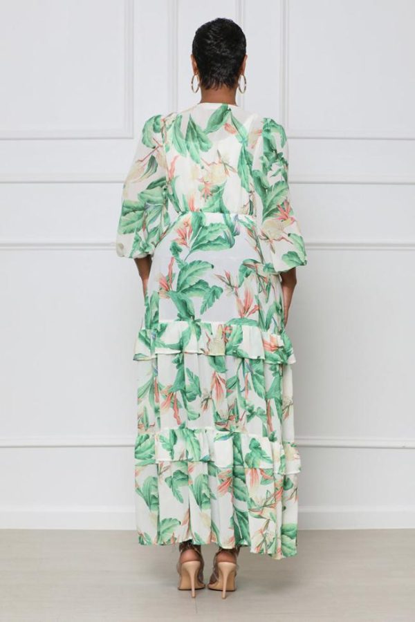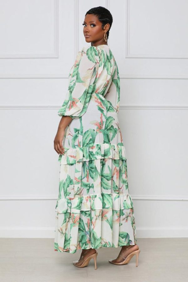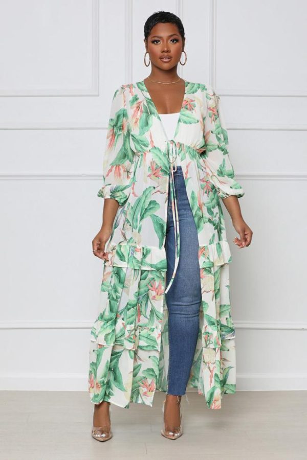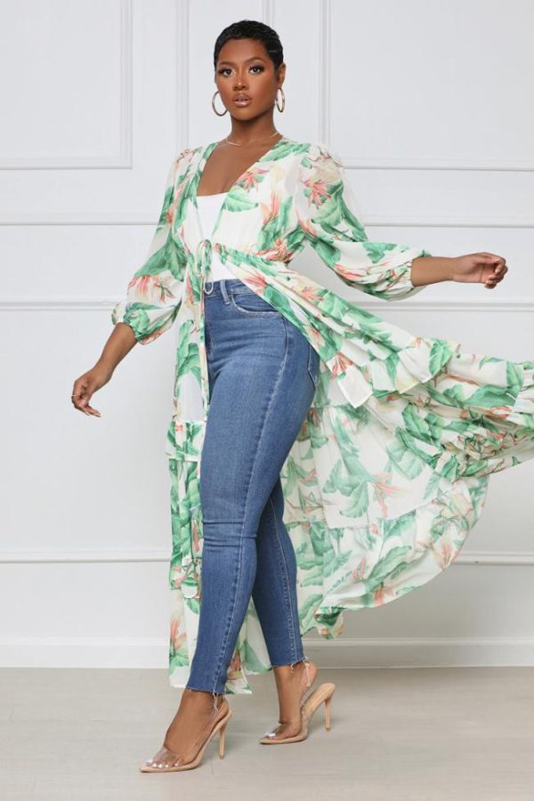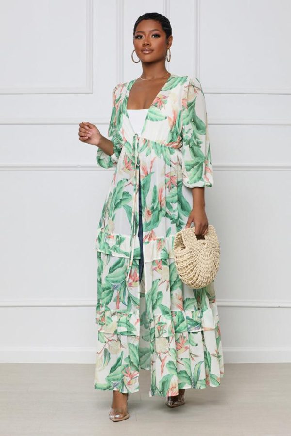 This breezy, floral-print kimono features an exotic print in lush greens and yellows, with long balloon sleeves and a tie at the front. Wear it as a swimsuit cover-up or over denim shorts and a bodysuit for a warm summer look.
