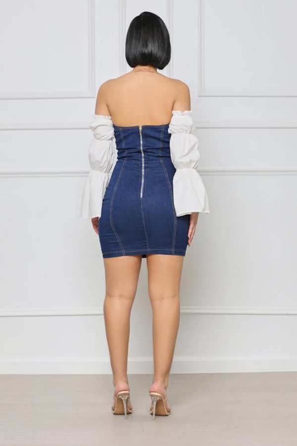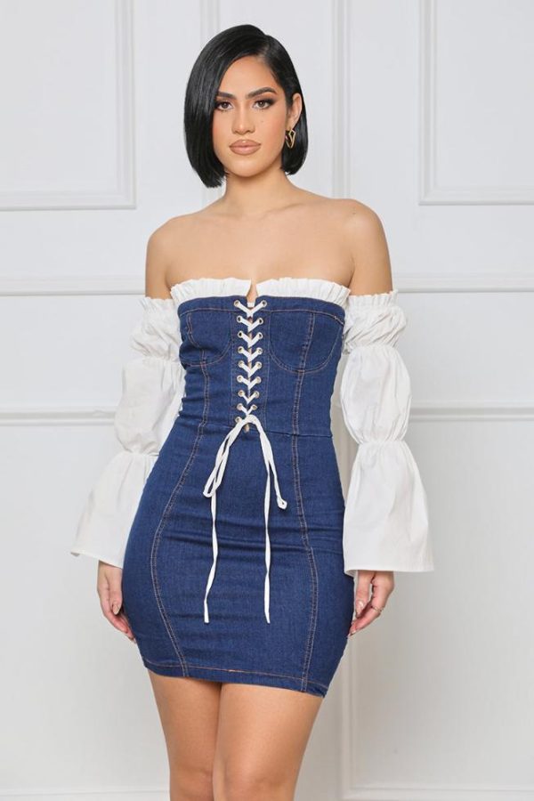 Take your day party look to another level in this fun denim dress featuring an off-the-shoulder neckline, lace-up design, long sleeves, and a figure-hugging fit. Style with a simple high heel, handbag, and gold accessories for a complete look.