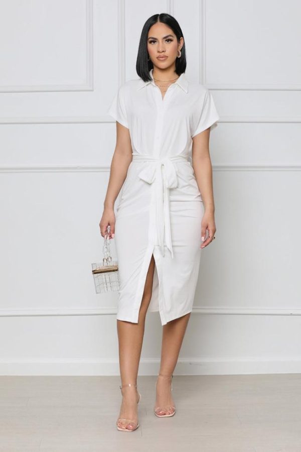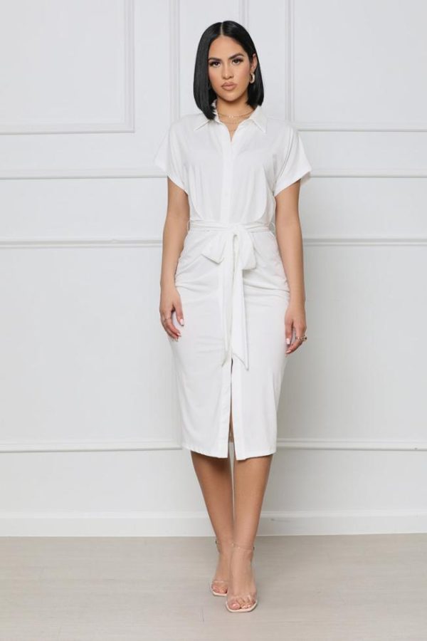 Make a statement at any event with the Chic Me Out Midi Dress. Perfect to wear to work or a networking event, this collared midi dress is made in a soft material and features a button-up front and wrap tie detail. Pair with black heels and a structured handbag!