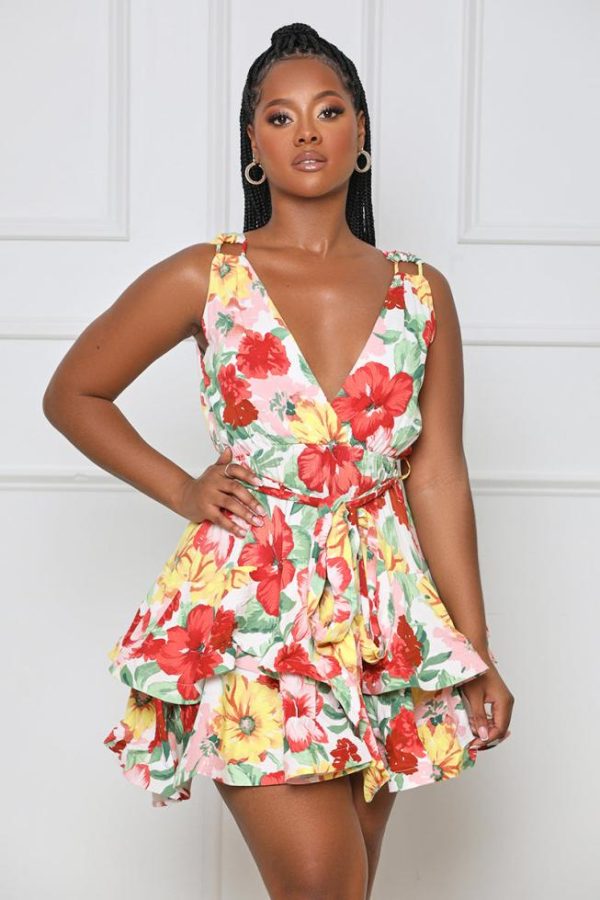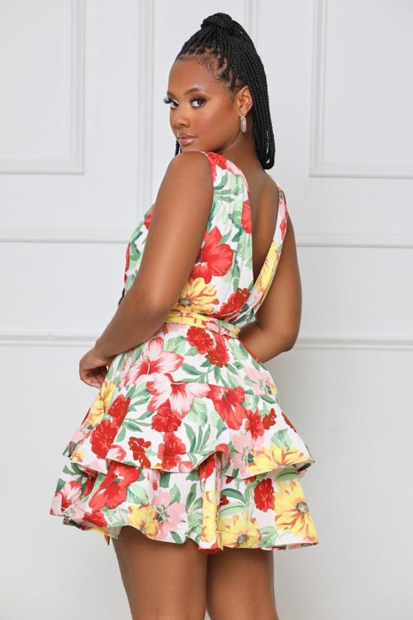 This ruffled mini dress is so luxurious you will never want to take it off. Made from soft and flowing fabric, with a wrap tie belt and vibrant floral print that adds a flirty touch. A plunge neckline draws attention to your face, and opens up your look for sophistication. Wear this to brunch with a pair of pumps and a cute handbag.