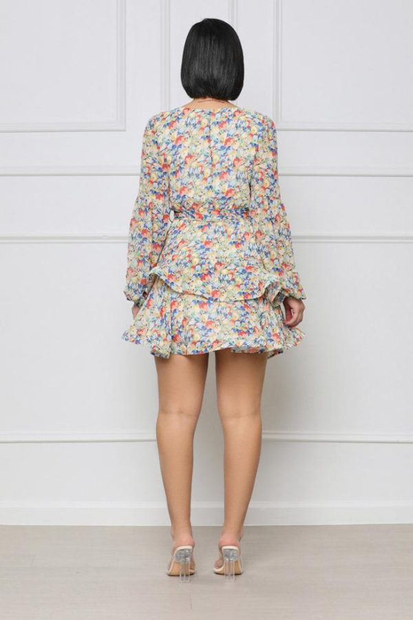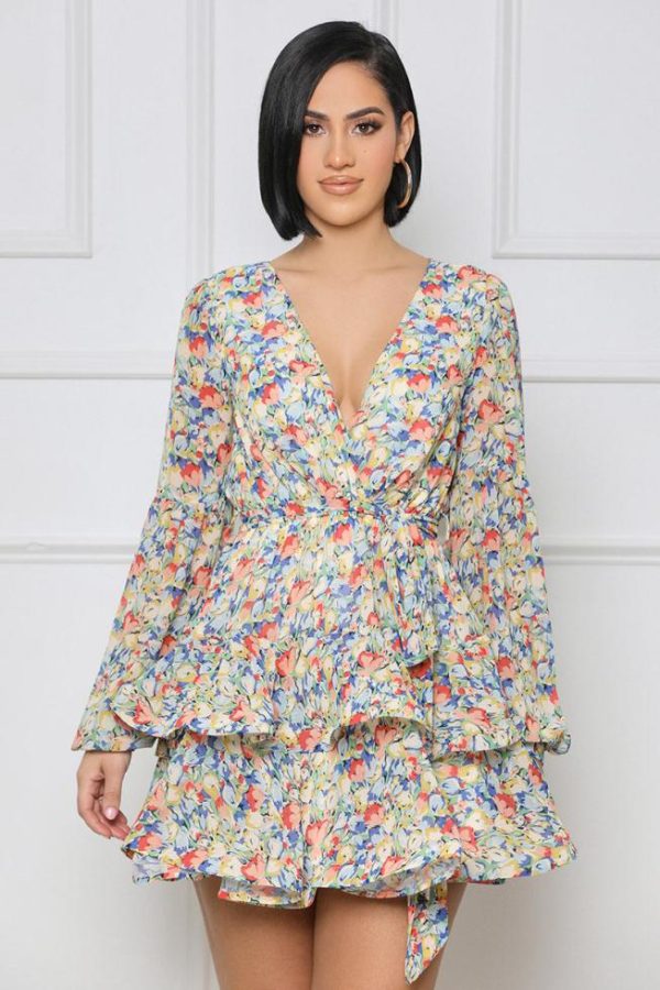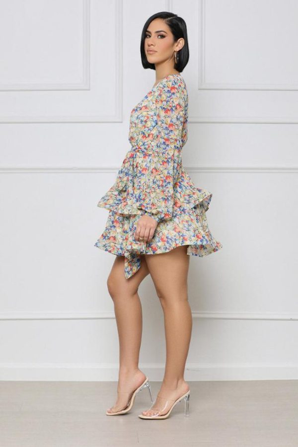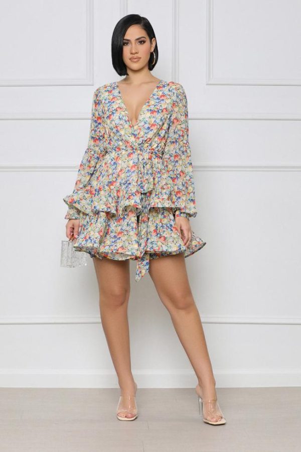 The plunging V neckline is supported by long sleeves and paired with a mid-thigh length bodice with a ruffled skirt that gives an A-line silhouette. This dress shows a wrap tie belt and one button closure in the back, which will have you standing out from the crowd. Wear this dress to brunch and pair with fashionable nude heels for a classy look.