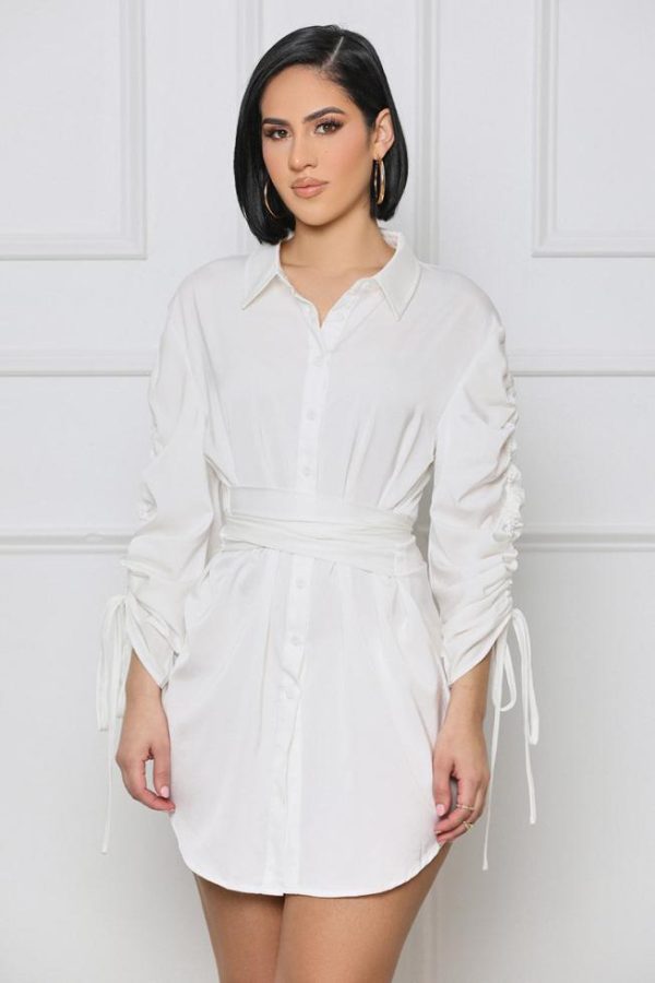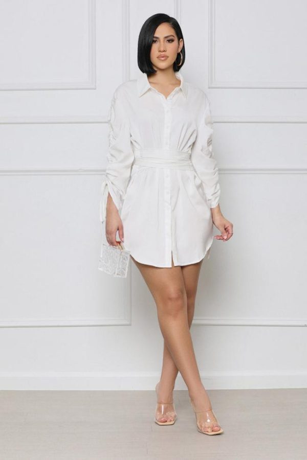 This isn’t your average shirt dress babe! Featuring a classic collar neckline, long ruched sleeves, a wrap tie, and full-length button front closure; this dress is perfect for many different occasions! Pair with a transparent high heel and handbag for a look you’ll love.