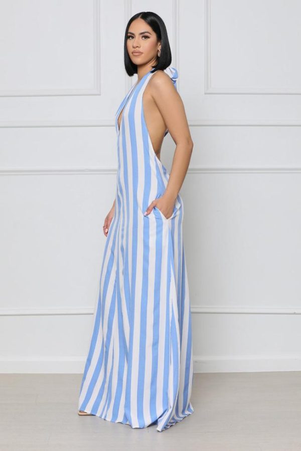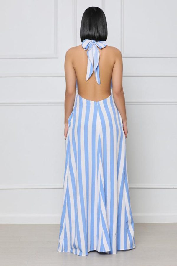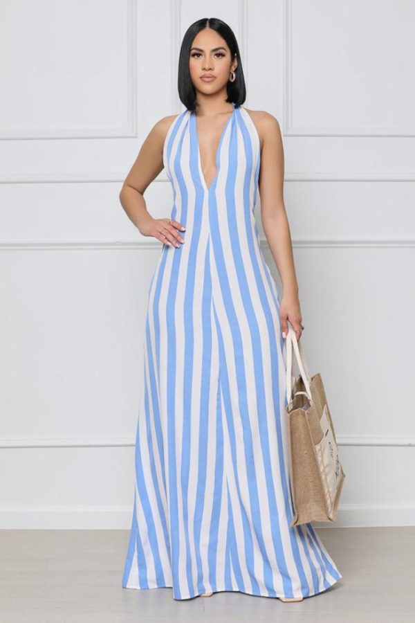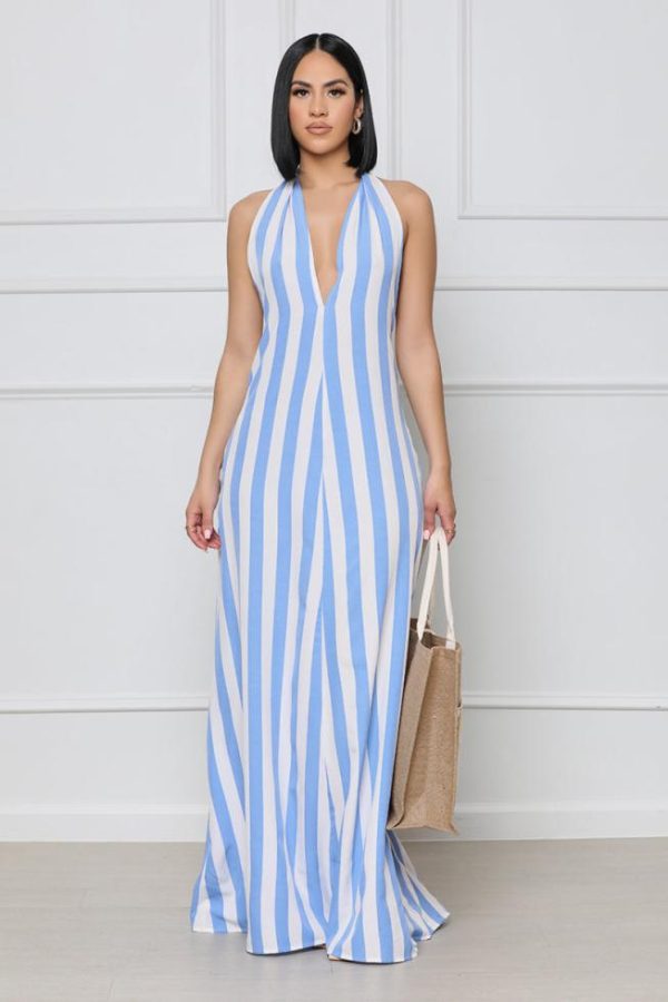The Striped Backless Halter Maxi Dress features a backless design, halter neck, and vertical stripes that offer a casual and contemporary style. This dress is the perfect piece to wear to brunch, at the beach, or anywhere you want a loose-fitting, airy look. Paired with nude heels and a straw handbag, this dress is sure to impress.