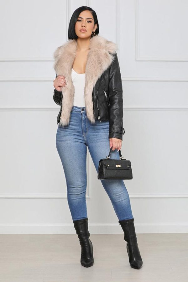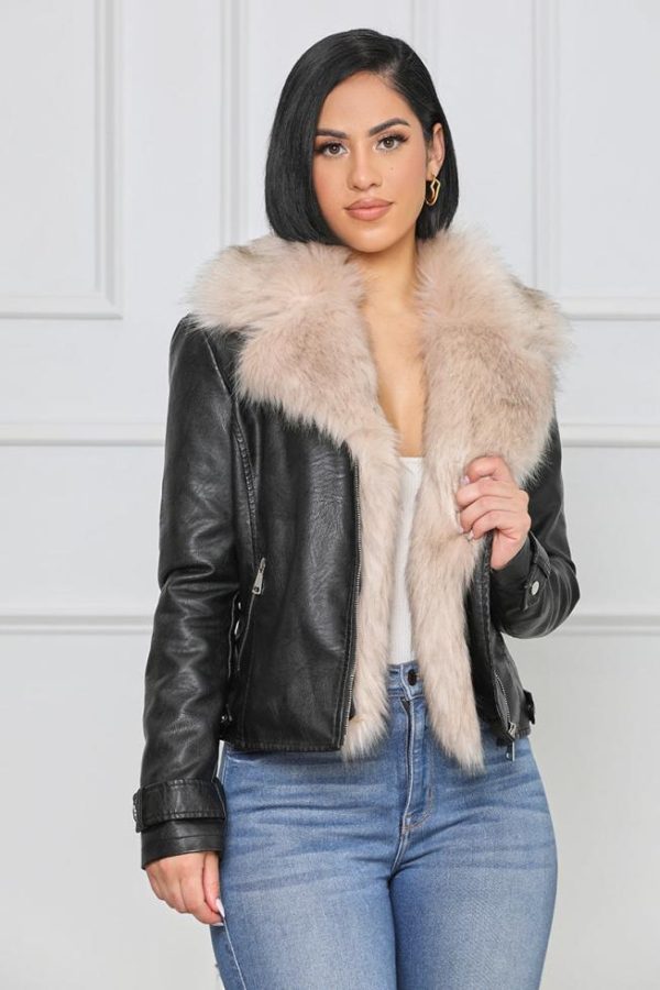Get cozy in this faux leather jacket featuring a faux fur interior, front pockets, and zip closure. Pair with a top, your favorite denim jeans, and boots for a complete look.