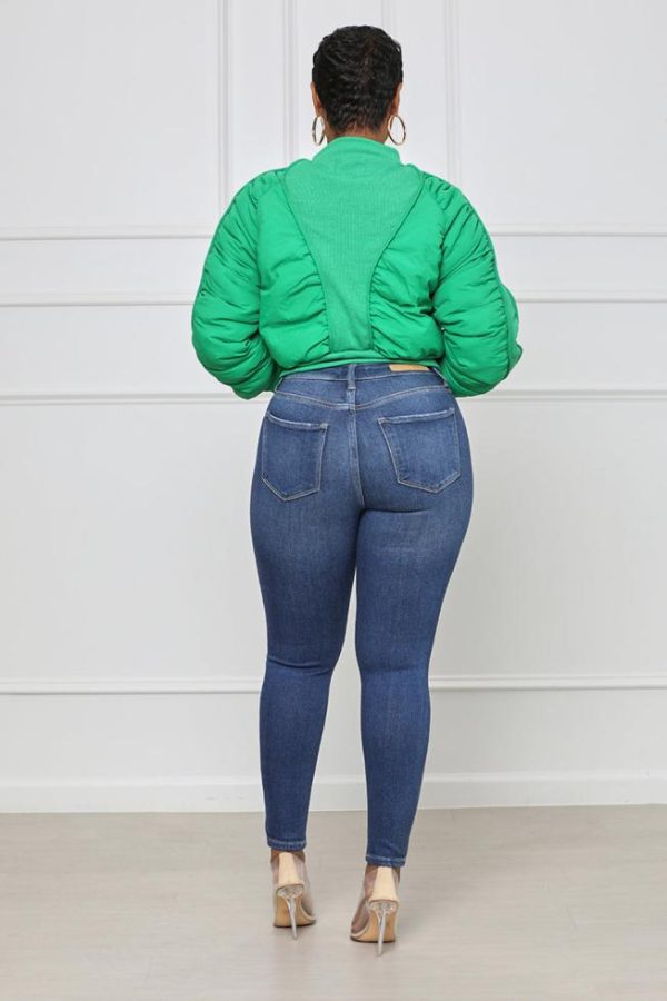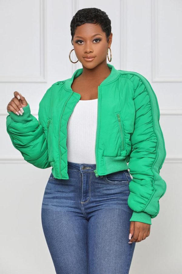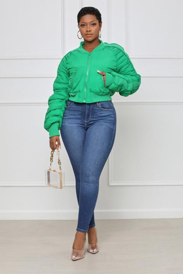 This sporty bomber jacket featuring a soft plush material, front zip closure, ruched design, elasticized detail and bright green color that’ll for sure make a bold statement. Pair with faux leather tights or jeans and a statement heel for a complete look.