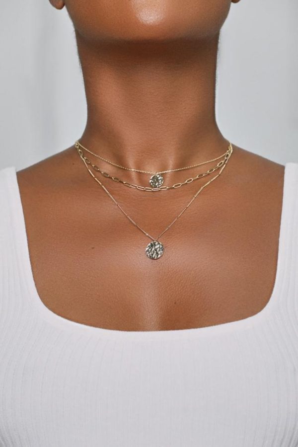 This layered gold necklace is the perfect combination of two simple yet eye-catching elements. Featuring three layered necklaces and textured circular gold pendants.Gold