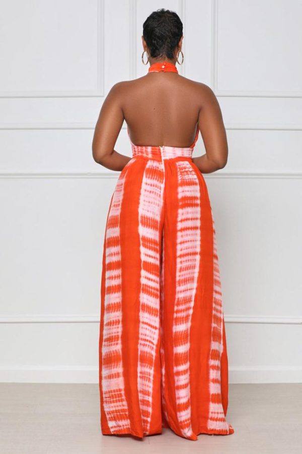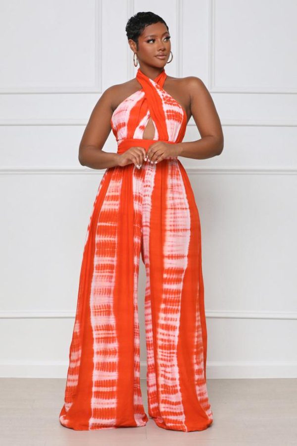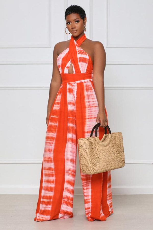 Takethis gorgeous jumpsuit for a spin on vacation. An all-in-one bust-accentuating Tie-Dye Jumpsuit piece that features a plunging v neckline, wide leg pant and halter neckline. This style is sitting pretty at the top of our wish list this season. Step out of your comfort zone and pair a deep v neck jumpsuit with your fave heels and slicked back hair.