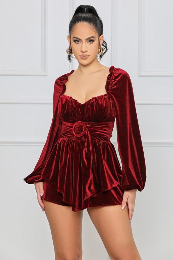 We’re loving this super cute velvet romper! Featuring a layered skort, attached D-ring belt design, sweetheart neckline, and back zipper closure; this piece gives a romantic vibe that is sure to make your boo fall even more in love! Pair with a simple high heel and a mini handbag for a chic and flirty look.