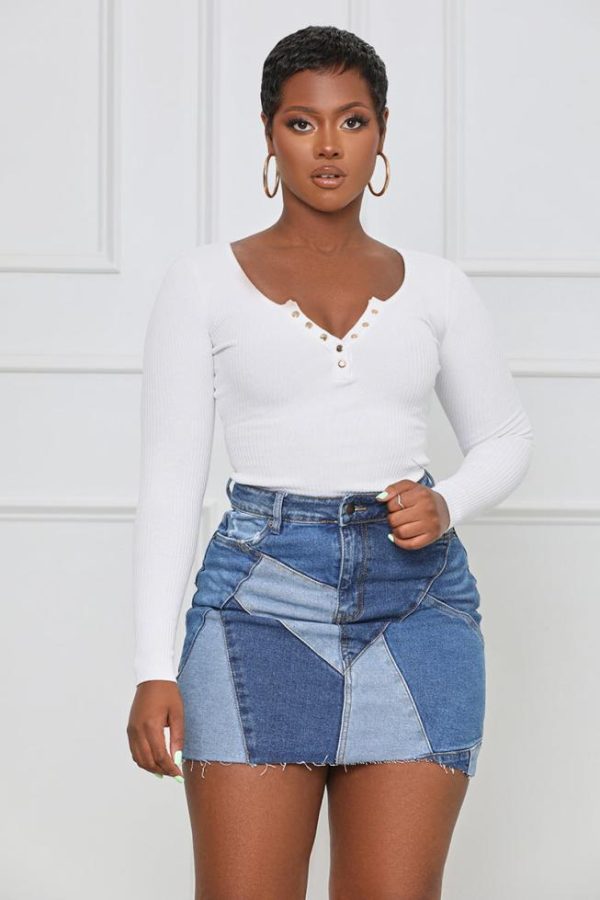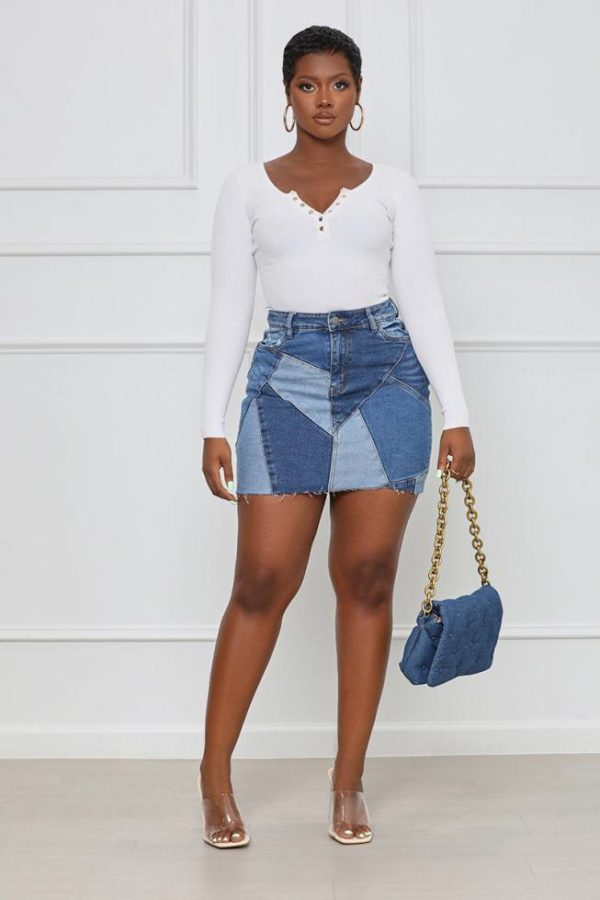 Add a bit of edge to your wardrobe with this denim skirt that features a mixed wash patchwork design, button and zipper fly closure, belt loops, and side pockets. Style with a simple top or bodysuit and a high heel or bootie for an elevated casual look!