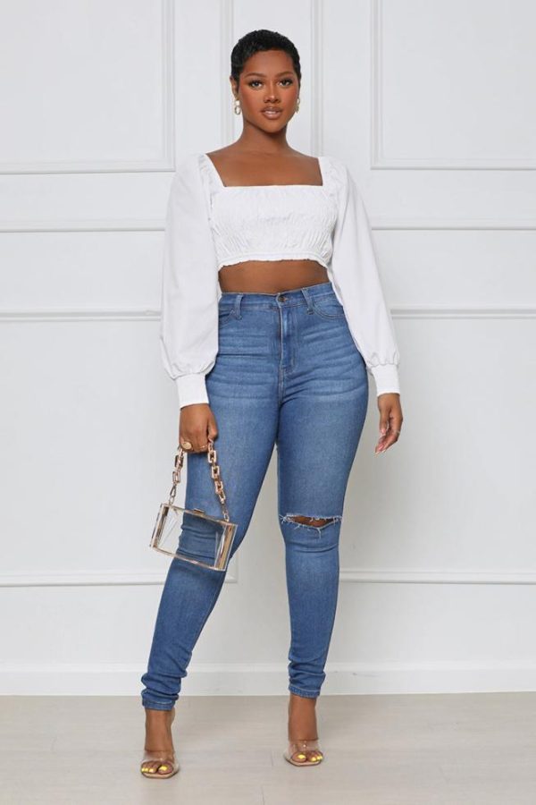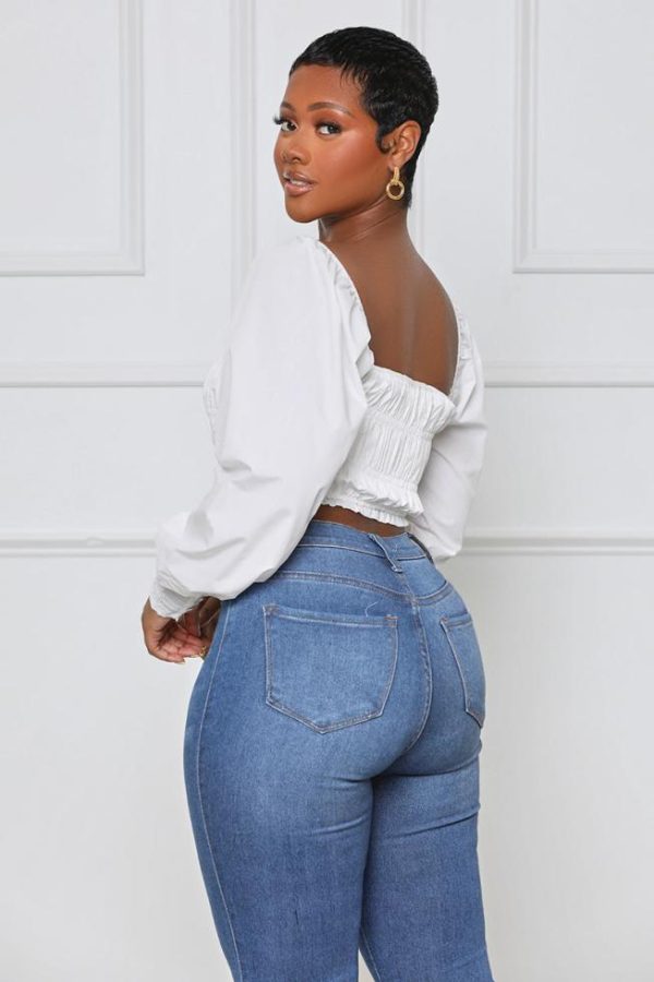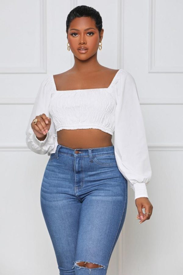 This top will for sure elevated your outfit; featuring a square neckline, elastic detail and long sleeves. What’s not to love? Pair with a high rise denim jean and high heels for a complete look.
