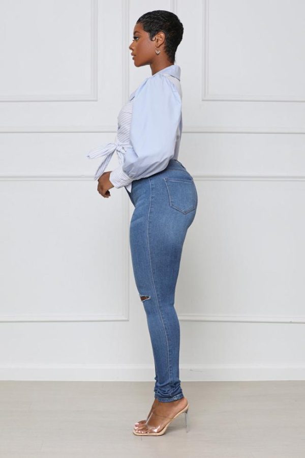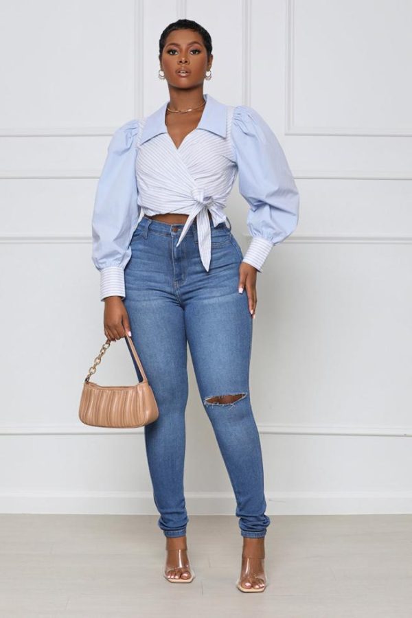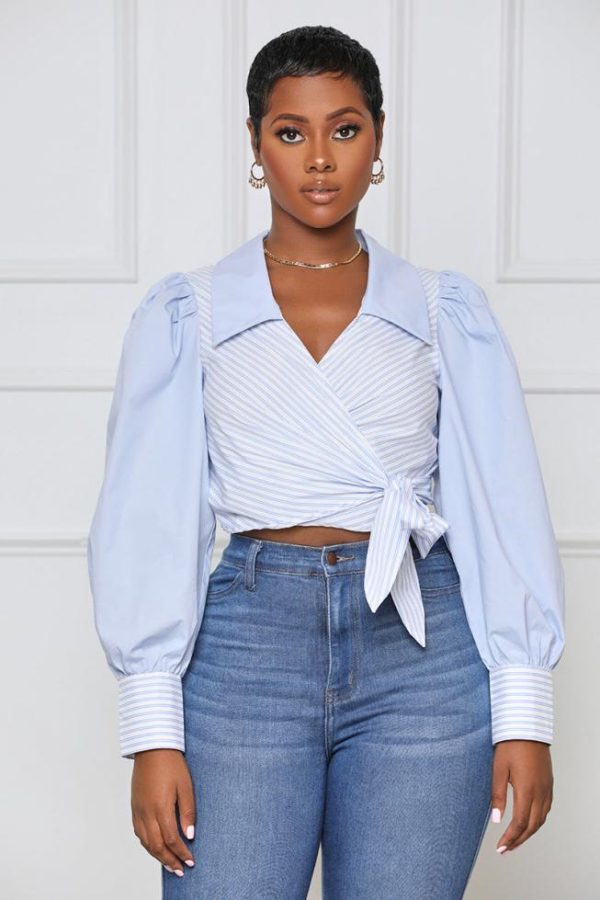 Women Tops | Lilly’s Kloset Striped Balloon Sleeve Wrap Crop Top Blue White