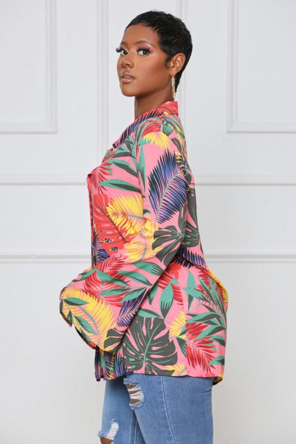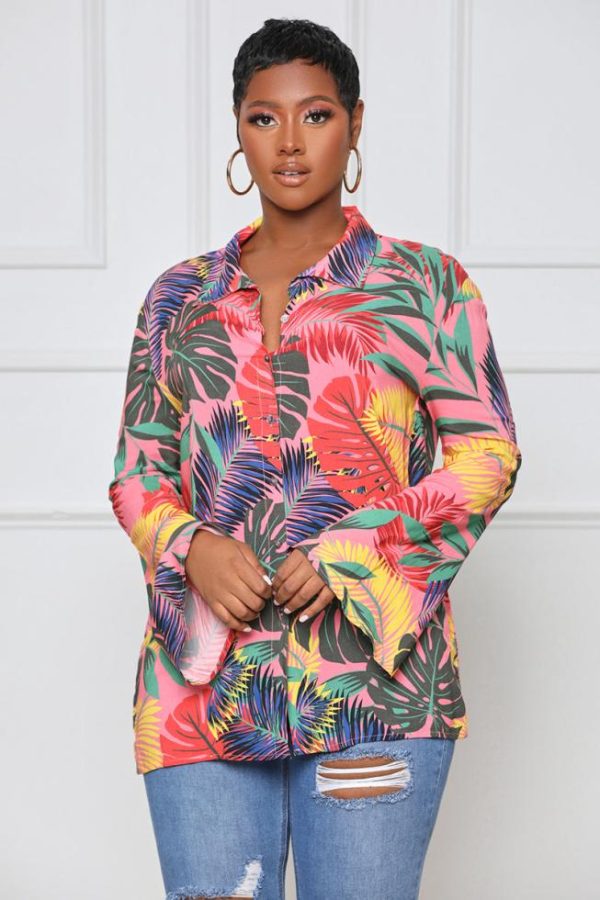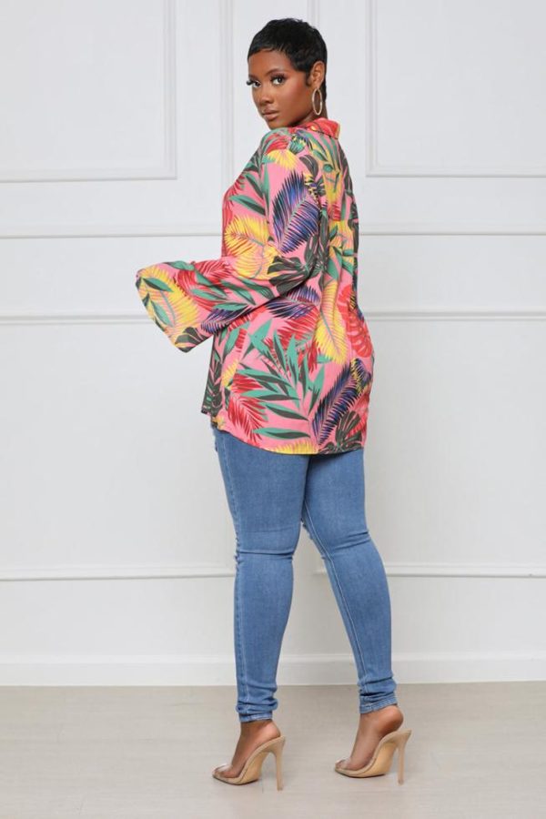 We’re bringing the vacay vibes to you with this Take Me to Paradise Button-Up Top Featuring a tropical print, classic collar neckline, button-up closure, and wide sleeves. Pair with denim shorts, nude high heel mule, and handbag for a complete look.